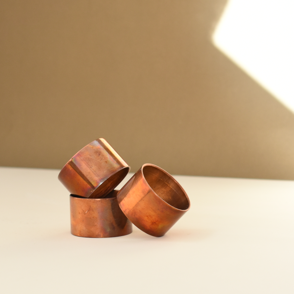 A set of solid copper napkin rings designed to bring a warmth and character to your table.